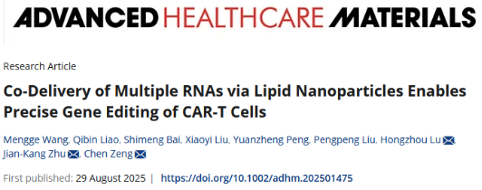 稿件来源:深圳市第三人民医院 发布时间:2025-09-01 19:20:532025年8月29日,深圳市第三人民医院(南方科技大学第二附属医院)卢洪洲教授团队与南方科技大学医学院/前沿生物技术学院朱健康院士、曾臣副研究员团队合作,在国际知名期刊《Advanced Healthcare Materials》(JCR分区Q1;5年平均影响因子10.8)上发表题为“Co-Delivery of Multiple RNAs via Lipid Nanoparticles Enables Precise Gene Editing of CAR-T Cells”的研究论文。该研究开发了一种基于脂质纳米颗粒(LNP)的新型递送系统,可同时携带多种RNA分子,实现对CAR-T细胞的高效、精准基因编辑,显著提升其抗肿瘤能力,为肿瘤免疫治疗提供了新策略。