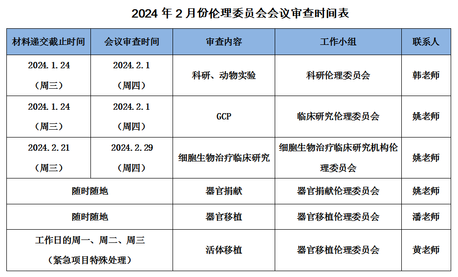 2024年2月份伦理委员会会议审查时间表