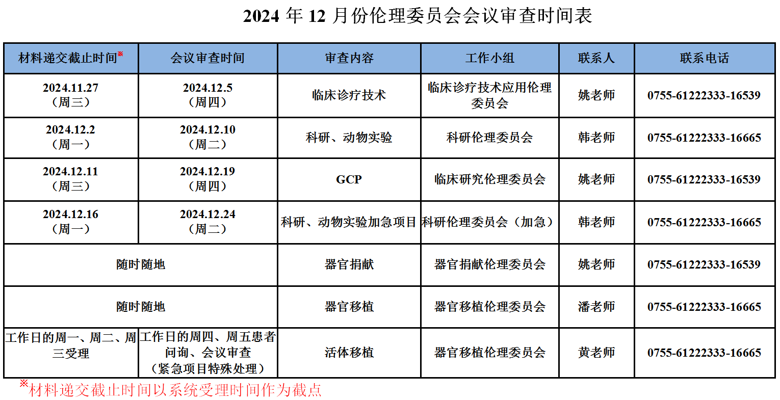 伦理委员会2024年12月会议审查时间安排如下,如有临时调整,将另行通知。
