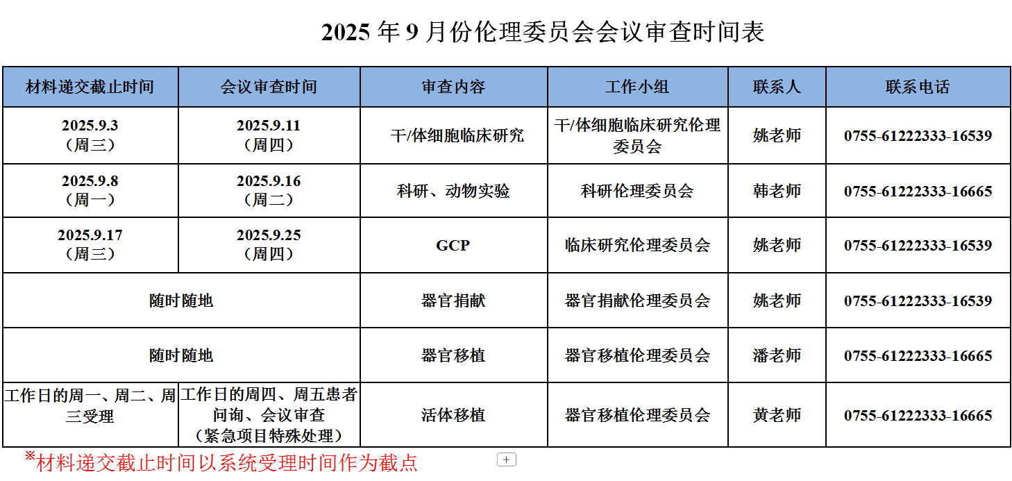 2025年9月伦理委员会会议审查时间安排
