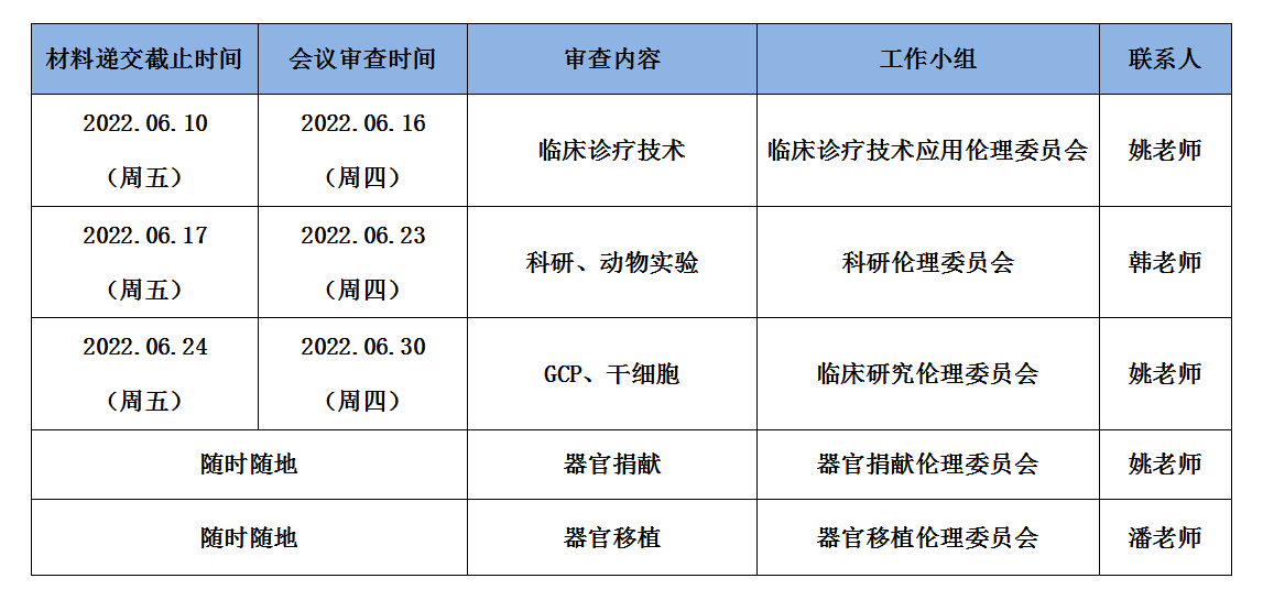 2022年6月份伦理委员会会议审查时间表