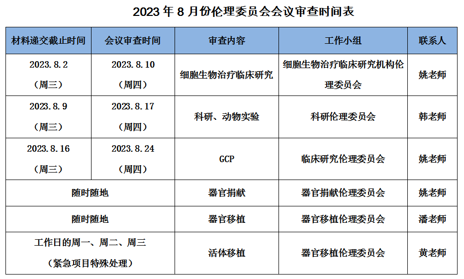 2023年8月份伦理委员会会议审查时间表