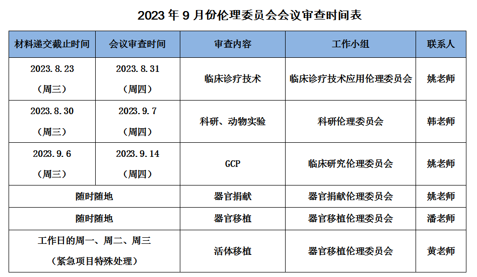 2023年9月份伦理委员会会议审查时间表