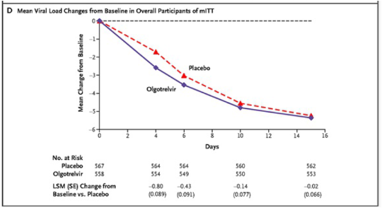 对比安慰剂组,奥格特韦钠组患者病毒载量从服药后开始病毒载量快速下降,在第4天(服药3天后)较基线达到最大差异,安慰剂组和奥格特韦钠组较基线分别下降1.40和2.20 log10拷贝/mL,两组间的最小二乘均值(LS mean)差异为0.8 log10拷贝/mL。在给药后第4天和第6天,对比安慰剂组,奥格特韦钠组均能较基线显著下降病毒载量(P值小于0.0001),特别是对于有重症高风险因素人群,在第4天奥格特韦钠组较安慰剂组下降了1.10 log10拷贝/mL,表明有重症高风险因素人群接受奥格特韦钠治疗后可更快的下降病毒载量,因而减少病毒感染导致的重症风险。